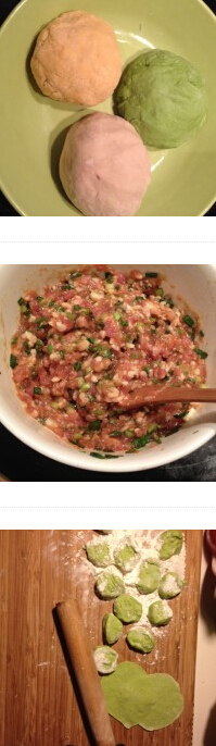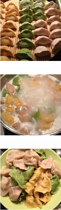 三色餃子的材料:面粉雞蛋,菠菜,草莓西紅柿,胡蘿卜,肉餡,白菜,小蔥,粉,橄欖油花椒油,五香粉,醬油,鹽,雞精 美食網(wǎng)