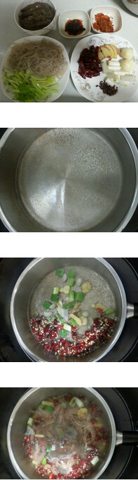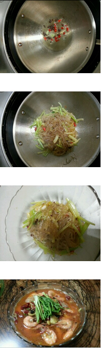 3.另起鍋,放少量油,放紅椒花椒炒香,加入芹菜粉條翻炒片刻,不放任何調(diào)料