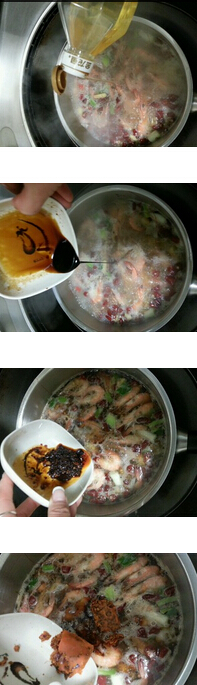 2.鍋中燒水,直到冒泡,先放入辣椒,花椒,蔥姜蒜在水里煮,這樣可以留住調(diào)料的本來(lái)香味,煮2分鐘加入蝦,加入色拉油,加入老抽,一小勺白糖,加入香辣醬,加入火鍋底料和料酒,轉(zhuǎn)小火煮3分鐘,讓蝦徹底熟透