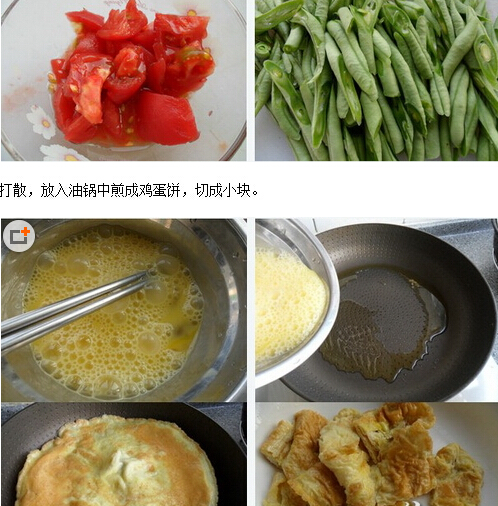 豇豆雞絲西紅柿燜面的材料:西紅柿、長豆角、雞蛋、面條,食用油、醬油、鹽、雞粉