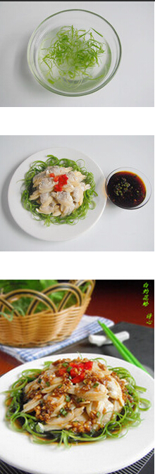 8 把蔥絲鋪在盤邊,再盛上花蛤肉,配上料汁,即可食用。