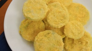 其實Fried Green Tomatoes是一個美國南方特有的料理。在其它地方基本上看不到。以前有部電影叫Fried Green Tomatoes,所以很多的美國人有聽說過這個料理,但不知道是真的。是真的料理。如果有機會可以做來嘗嘗。