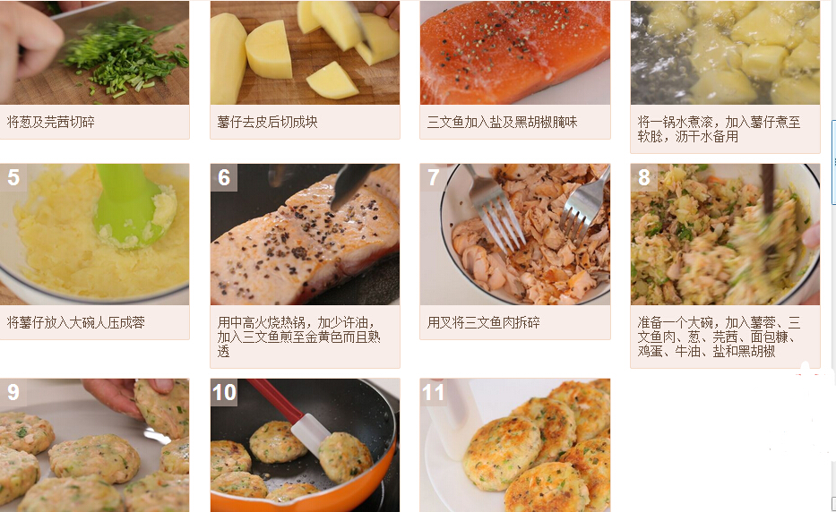 香煎三文魚的材料:三文魚柳約250g,中型馬鈴薯約150g,面包糠50g,牛油20g,蔥10g,香菜10g,雞蛋1只,鹽,黑胡椒
