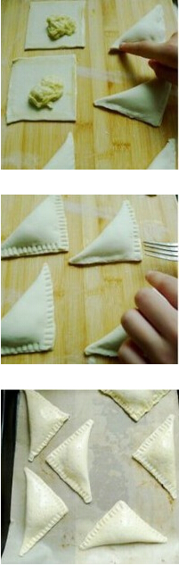3.用勺子取適量榴蓮肉放入面片的中間,在面片的四邊刷上少許打勻的雞蛋液,對折面片成三角形,用手將邊緣處壓緊