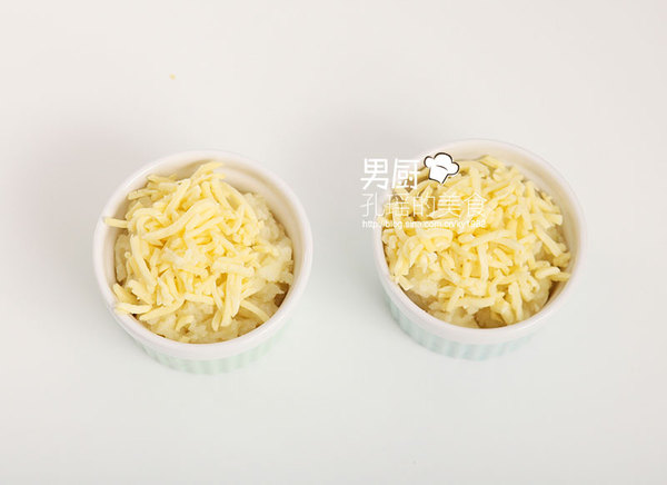 6、取出烤碗,倒入土豆泥,表層均勻地鋪滿馬蘇里拉奶酪。