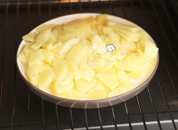 3、把土豆片裝入扁平的盤中,放入蒸烤箱中層。水箱裝滿水,選擇純蒸功能,(用蒸鍋也可以)溫度100度,時間10分鐘,按“開始鍵”啟動。