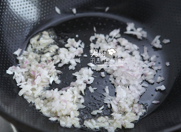 2、熱鍋融化黃油,再下入洋蔥煸至半透明。