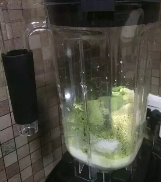 2.料理機(jī)裡依次加入冰、雪糕、牛奶、糖、抹茶粉、香草油,開機(jī),打大概90秒,直到把冰塊打成沙冰的狀態(tài)!