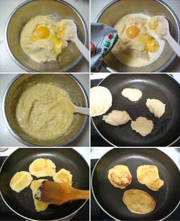 4.平底鍋倒油燒熱,用勺舀起面糊放進(jìn)平底鍋,翻面用木鏟壓扁成餅,兩面烙至金黃色即可出鍋食用。的做法
