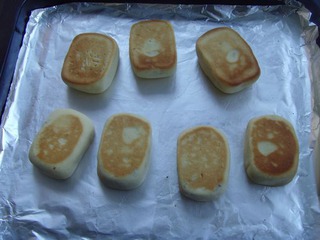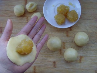 13 取一份按扁,包入鳳梨餡,用手掌搓圓,朝下放置。