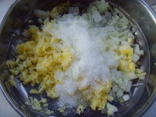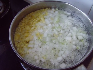 2 將冬瓜、菠蘿、白糖、冰糖依次倒入鍋中混合,靜置半小時之后混合果肉會出水。