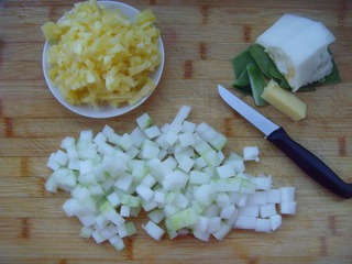 1 菠蘿去皮去芯,用淡鹽水浸泡半小時之后瀝水切成小塊;冬瓜去皮去籽,切成小塊。
