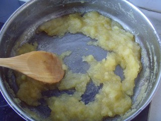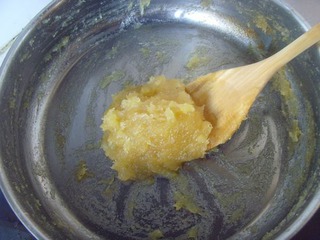 5 取3/4份的果料用料理機(jī)打成蓉狀,倒回鍋中小火慢慢翻炒。