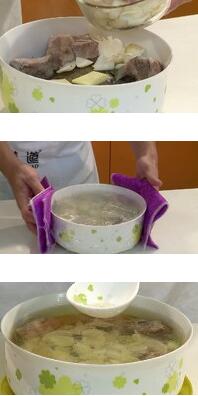 3.把金鼓魚,排骨,百合,生姜放入燉盅,加入1000ml沸水,用保鮮膜封好燉盅大火蒸制1.5小時。