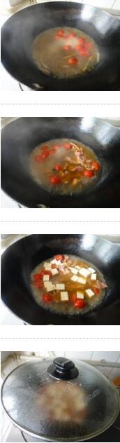 2. 坐鍋倒油下入小番茄炒一炒后倒入清水大火燒開(kāi),放入肉片攪拌一下,燒開(kāi)后再放入豆腐一起煮開(kāi),煮開(kāi)轉(zhuǎn)小火蓋住蓋子煮10分鐘,最后放入鹽調(diào)味即可