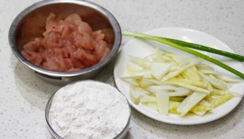 1.豬里脊肉洗凈切成片,加入紅苕粉和清水?dāng)嚢杈鶆?,苦筍切片汆水后撈出備用。