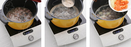 4、浮沫撇干凈之后轉(zhuǎn)中小火煮約一個半小時,加入土豆和胡蘿卜,大火煮開后,再轉(zhuǎn)中小火,煮二十分鐘左右,盛出后加一點點鹽食用即可。