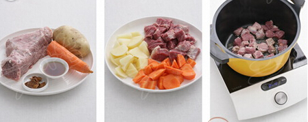 1、土豆和胡蘿卜去皮后洗凈切成滾刀塊,牛腩洗凈切成約3厘米見方的塊,姜切片備用。
