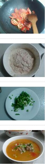 番茄滑肉湯的材料:豬瘦肉200克,番茄2個(gè),豬油,鹽,蔥花,紅薯