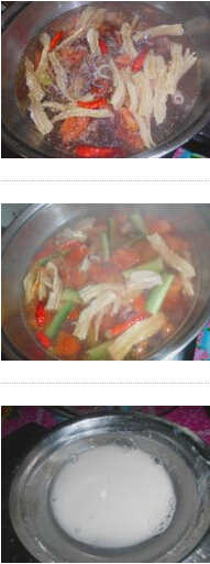 4.湯鍋里先放干辣椒煮的滾燙,再把腐竹節(jié)、西紅柿塊、小魷魚都下到湯鍋里煮