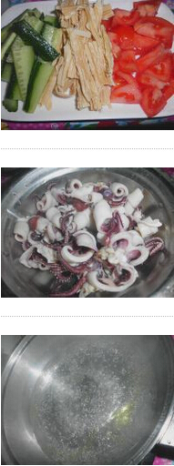 酸辣魷魚湯的材料:小魷魚5只,腐竹3根,黃瓜半根,西紅柿1個,雞蛋1個,油,鹽,生姜、蔥、干辣椒,地瓜粉
