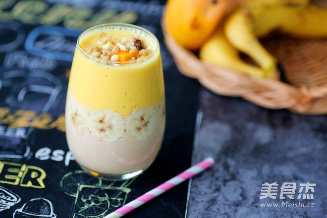 2.另取半個(gè)香蕉切薄片貼到杯壁上,更美觀好看。