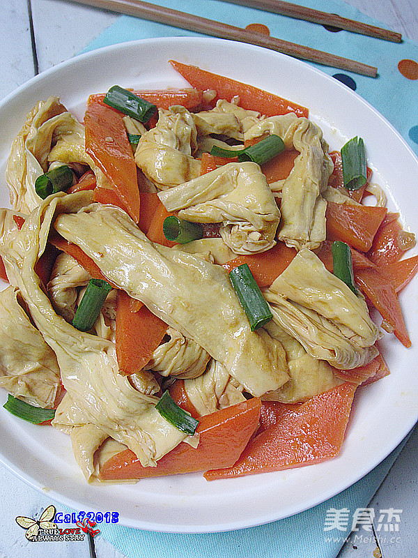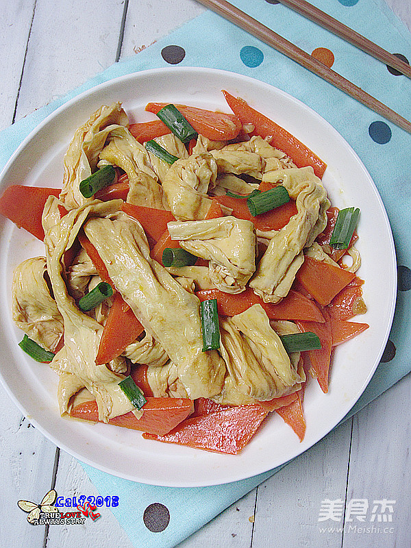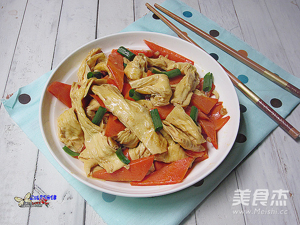 8.胡蘿卜炒至八九成熟時,加入腐竹翻炒,加少許鹽調(diào)味