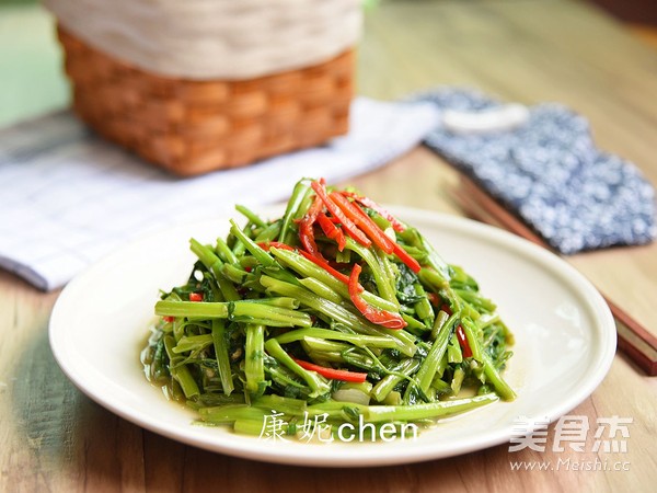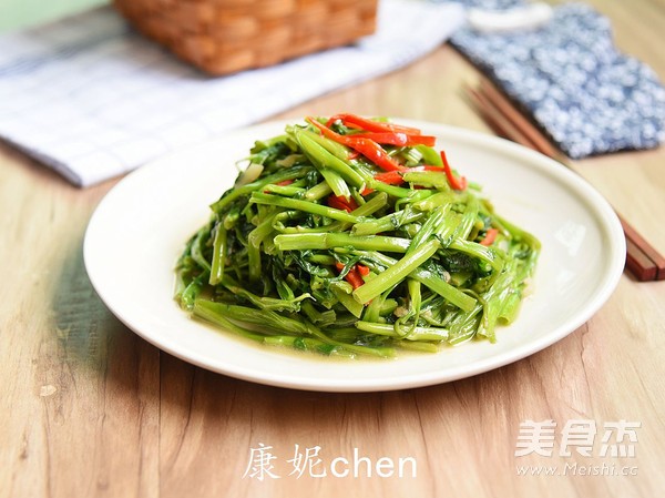 6.當(dāng)通菜翻炒至七八成熟時,放入炒好的調(diào)料,翻炒幾下,讓調(diào)料混合均勻,可以根據(jù)口味放入少許鹽即可盛碟上桌
