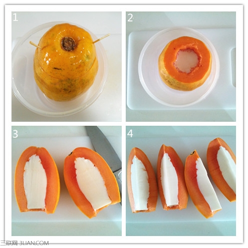 7.圖1-將切出的木瓜頂部蓋上,用牙簽固定位置,放入冰箱冷藏2-3小時(shí)至凝固。