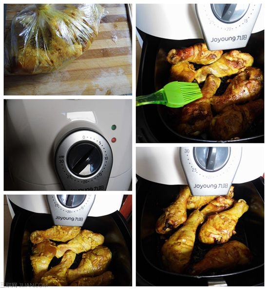 9.中途可以拉出炸籃查看烤制情況,將剩余的腌料水,用刷子抹在雞腿上,翻面