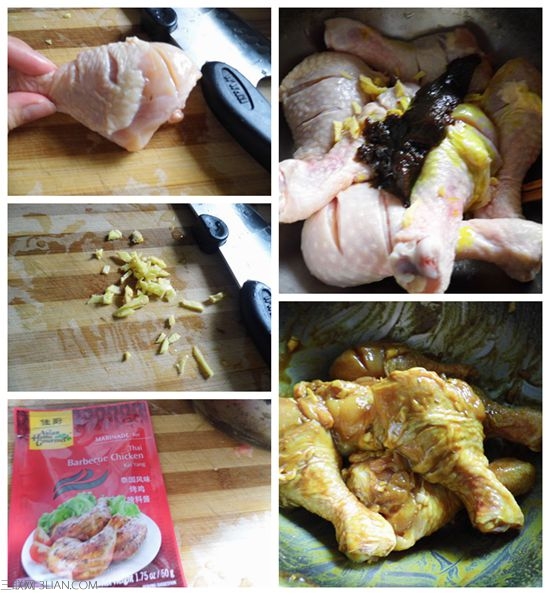 4.倒入泰式烤雞腌料和生姜末,1勺鹽