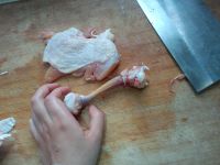 2.取雞腿,在側(cè)位割一刀,然后在根部位置把一圈的肉割斷