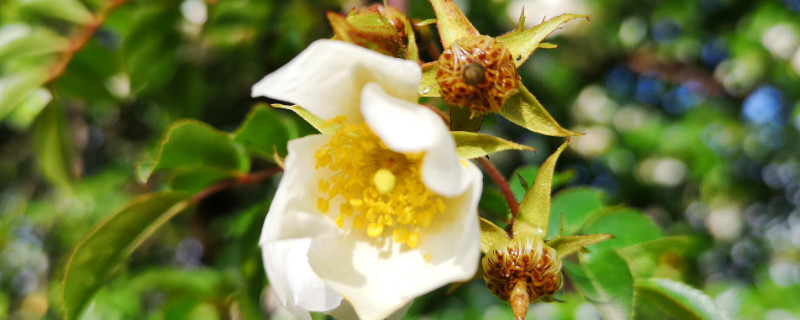 金櫻子高可達(dá)5米,它的小枝粗壯,而且散生扁彎皮刺,小葉為革質(zhì),形狀為橢圓狀卵形、倒卵形或披針狀卵形,葉緣有尖銳鋸齒,它的花朵單生于葉腋,花期在4-6月份,花朵顏色為白色,花瓣形狀為寬倒卵形。