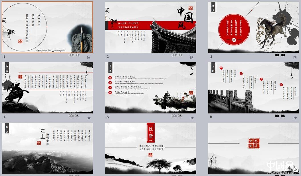生活中,書法一詞另具備以下含義。第一,某幅書寫作品的代稱或者所有書寫作品的統(tǒng)稱;第二,一種藝術類別,一般指書寫漢字的藝術。康有為在《廣藝舟雙楫》中說:”唐言結(jié)構(gòu),宋尚意趣“,由此可知唐代書法的法度追求最高、最嚴謹,唐代書法成就也是書法史上最頂峰的。家佳樂文學小編為您帶來古香古色動態(tài)書法PPT模板,適用于文化匯報、教育匯報等。