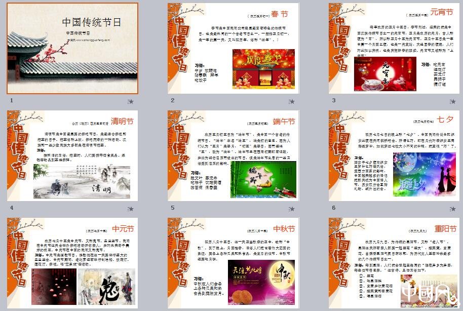 中國(guó)的傳統(tǒng)節(jié)日形式多樣,內(nèi)容豐富多樣,是我們中華民族悠久的歷史文化的一個(gè)組成部分。傳統(tǒng)節(jié)日的形成過(guò)程,是一個(gè)民族或國(guó)家的歷史文化長(zhǎng)期積淀凝聚的過(guò)程,我國(guó)的傳統(tǒng)節(jié)日,無(wú)一不是從遠(yuǎn)古發(fā)展過(guò)來(lái)的。家佳樂(lè)文學(xué)小編為您推薦家佳樂(lè)文學(xué)中國(guó)傳統(tǒng)節(jié)日PPT模板,適用于商務(wù)演講、會(huì)議報(bào)告、論文答辯等。
