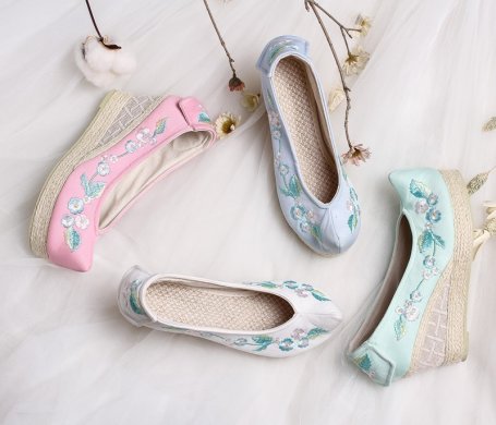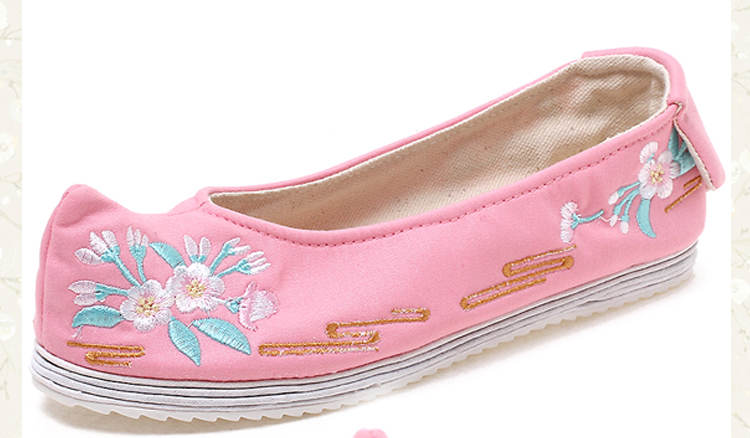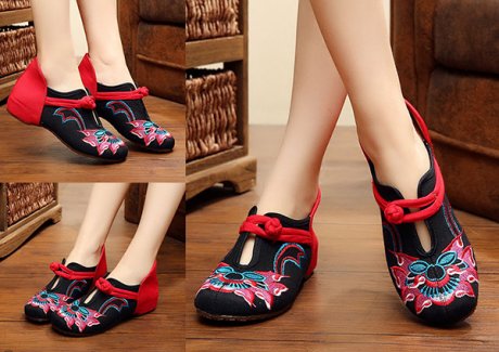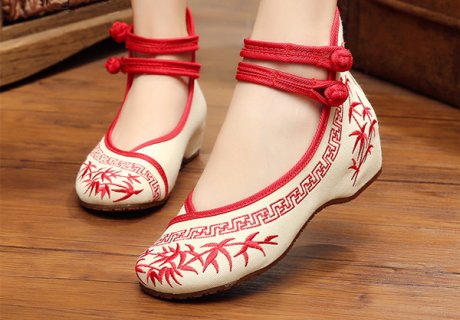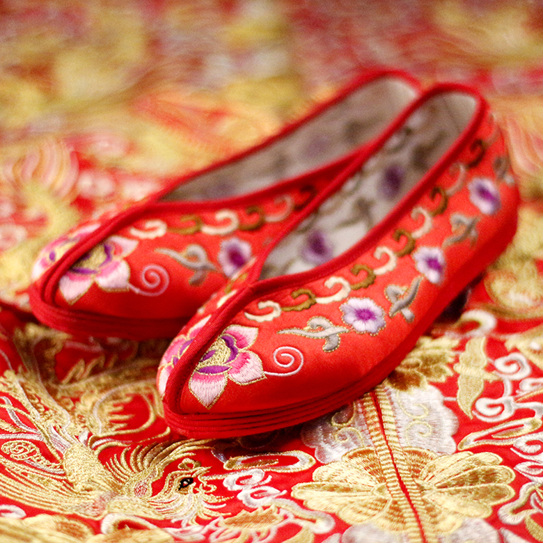 繡花鞋的刺繡修飾手法沿襲了東方裝裝飾唯美的審美風(fēng)尚,注重鞋面的章法,和鞋幫的鋪陳,并配以鞋口、鞋底的工藝飾條。應(yīng)用彩色絲線從鞋頭到鞋跟甚至鞋底和鞋墊上都繡上繁縟華……
